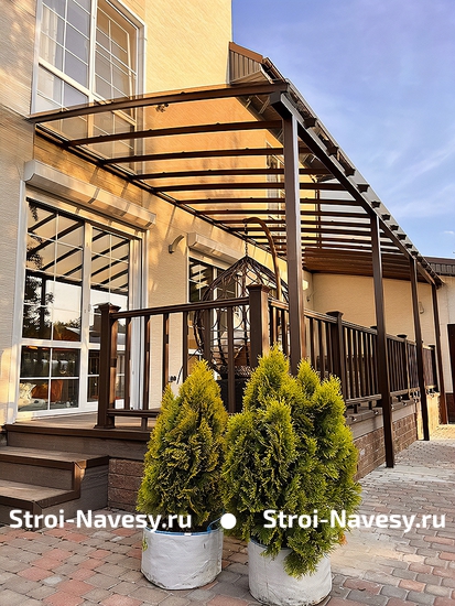 Современный односкатный хай-тек навес для веранды с поликарбонатом